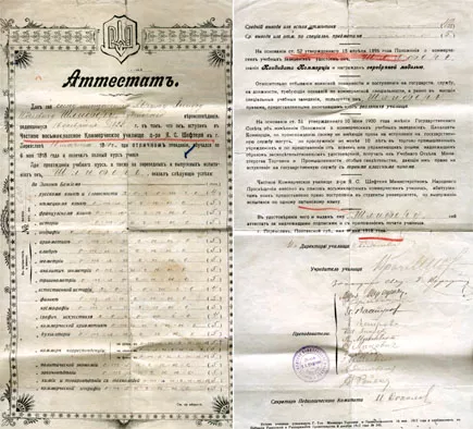 The certificate given to my father Iosif Shlifer, that he has ended private eight-class commercial school in the city of Pereyaslav, in 1918, with excellent results