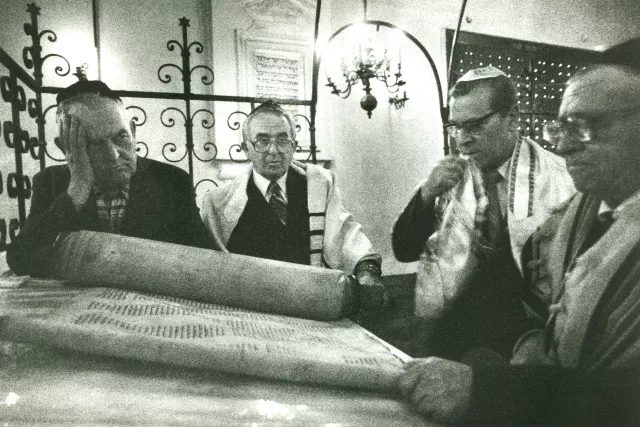 I also meet other Cracow Jews on Sabbath and at festivals at the synagogue. But not many people come to the synagogue [Remuh synagogue on Szeroka Street], and unfortunately we can't make up a minyan. The only ones who come are [Wlodzimierz] Stein, Tuszynski, Akerman, Liban. Liban is this kind of caretaker, shammash, who didn't start coming to the synagogue until 1989. Or maybe even later. Usually there are five of us, but [Henryk] Halkowski [trained as an architect, but by choice a journalist and translator, author of a collection of essays called The Jewish Life] also comes in at the very end of the prayers. And when groups [of tourists] come to the synagogue, mostly from Israel, then there is a minyan. Jews from other countries come too, and then we usually speak in English in the synagogue.