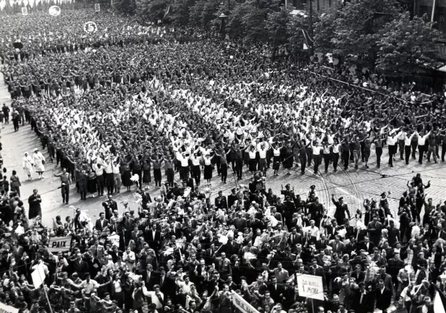 In 1952 I was even given the task of organizing this masquerade. A party task. Our school, the University of Political Science, was to create the slogan MIR [PEACE] using white and blue shirts.