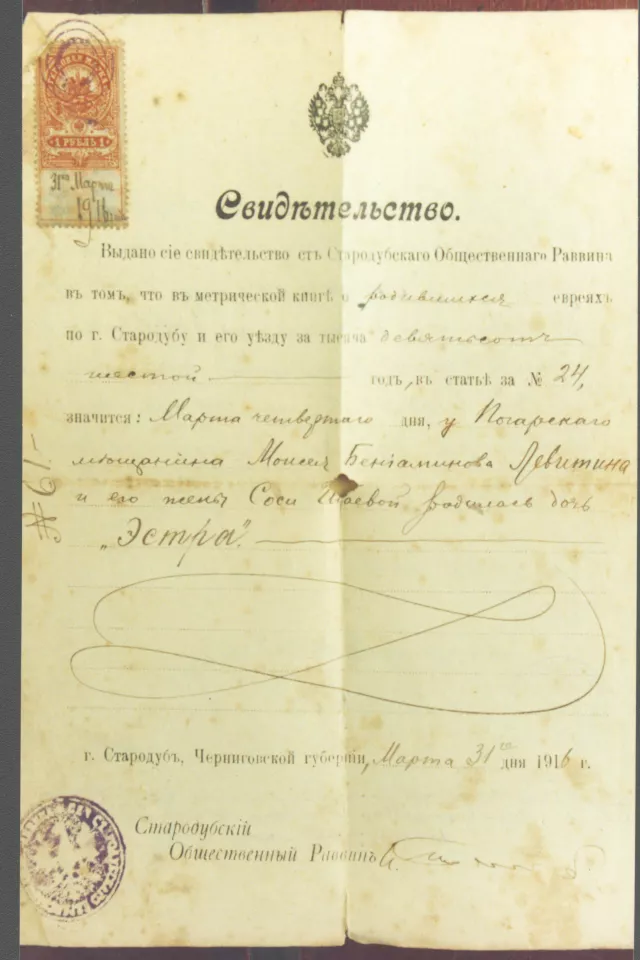 In the register book of the Jews born in Starodub in 1906, there is a note, 'Estra Levitin was born on March 4, 1906.'