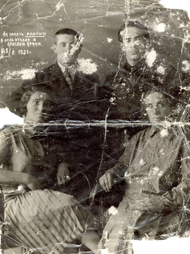 In this photo, taken in Kiev in 1931, my mother, Esfir Dovgalevskaya, is seated on the right. Next to her is my sister Sonya Dovgalevskaya. Standing on the left is my brother David, and on the right my brother Pinya. The photo was taken just before David went to serve in the Red Army.