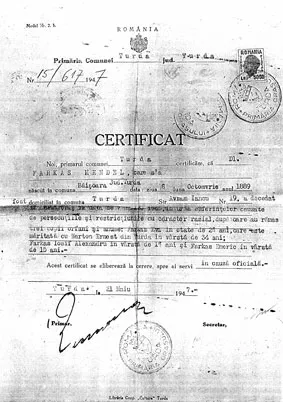 This certificate was issued upon our request by the town hall from Turda, we didn't know how things would develop after the war, so we requested a certificate to be issued about the conditions my father Mendel Farkas has died in.