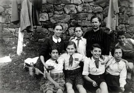 Here I am with other children at the Jewish youth camp in Tserovo village, organized by ‘Akeva’. On the back of the photo there is an inscription in ink: Tserovo 4th August 1940. In the first row, from right to left, are my friends Viska Lazarova, Sophka, me, Lily. Behind Lily is my mother Elvira Lidgi who had come to see us. I don't remember anything about the other people. We are wearing the ‘Akeva’ uniforms.