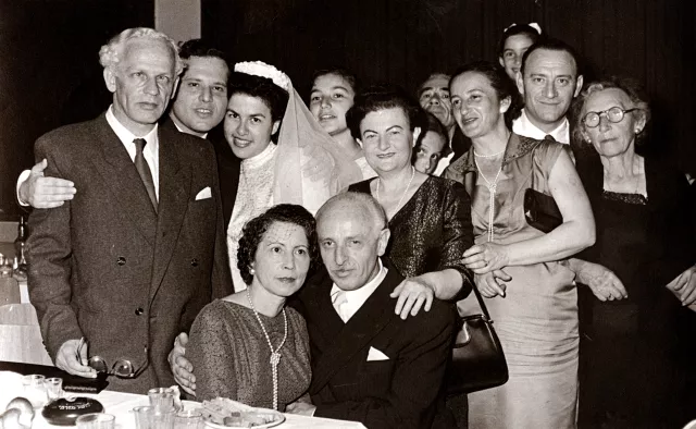 It was the wedding of my brother Maurycy’s son, who we called Rysio, though his real name is Henryk. Maurycy is standing first on the left, next to him is Rysio, then Rysio’s wife Dina, Maurycy’s wife Lola, my sister Ziuka, her husband Chaskiel Majtek and his mother. At the table are sitting my brother Artur and his wife Anka.