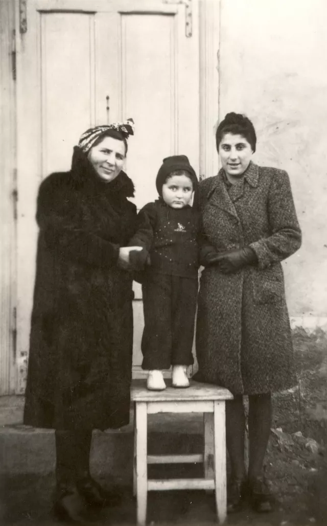Tohle je fotografie z Nyírbátoru, kde žila moje sestra Jolana (Fried, rozená Kahan). Stojí nalevo, já jsem napravo a uprostřed je její holčička, dcera Věruška. Byla maličká, tady jí mohly být tak čtyři. Tohle je taky stará fotka.