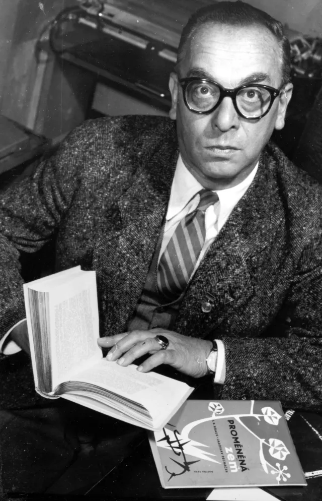Tato fotografie, na níž je můj otec František Robert Kraus, byla pořízena během autogramiády druhého vydání jeho románu "Proměněná země" v Praze v roce 1960.