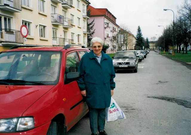 Na tomto obrázku jsem já v Sezimově Ústí u Tábora. Pořídila ho moje kamarádka Hana Kodičková, která za mnou přijela na návštěvu. Stojím vedle jejího auta na ulici, kde jsem se svým manželem Jiřím Meislem žila skoro 25 let.