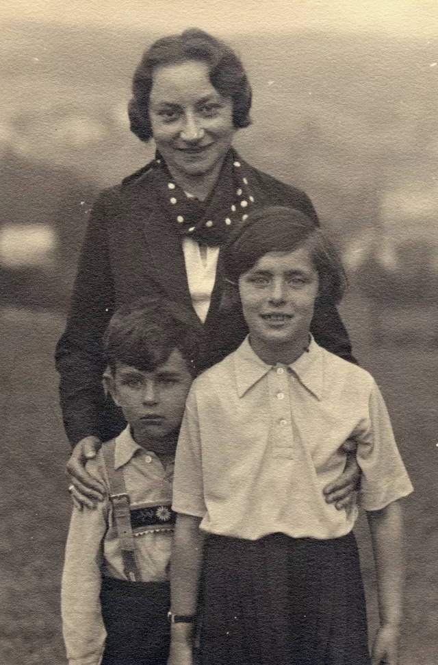 Tohle jsme můj bratr Viktor Munk a já s tetou Elsou Edererovou (rozenou Náchodovou). Fotografie je nejspíše z roku 1932, roku, kdy se narodil bratr Jiří. My děti jsme vůbec nevěděly, že se má narodit, nikdo nám nic neřekl a na mamince to vidět nebylo, takže to bylo velké překvapení.