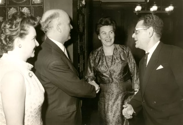 Tahle fotka je z roku 1967 na recepci na radnici Západního Berlína, kde jsem pracoval jako zahraniční dopisovatel Československého rozhlasu. Jsem na fotce úplně napravo. Moje manželka Vlasta, ta usmívající se žena vedle mě, si potřásá rukou s nějakými účastníky recepce.