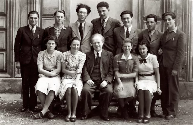 Na této fotce jsem já se svými spolužáky během posledního roku na Židovském gymnáziu v Brně. Fotka byla pořízena v roce 1939. Na obrázku jsem první zleva a vedle mě je moje kamarádka Helga.