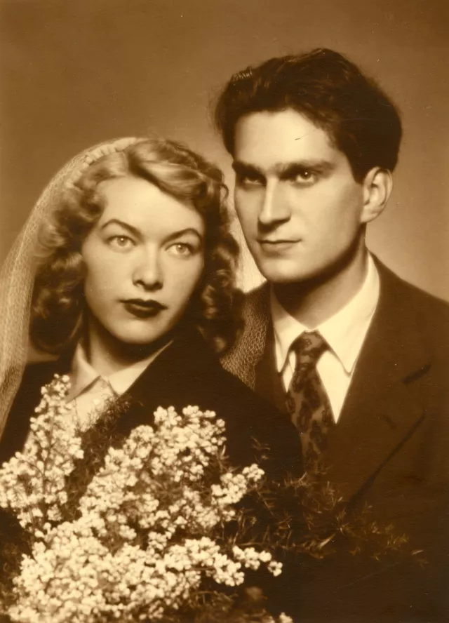 Tohle je naše svatební fotografie z roku 1954. Svoji ženu Libuši, rozenou Kvasničkovou, jsem poznal v roce 1952. Byla o tři roky mladší než já a pocházela z Moravy. Poznali jsme se na koleji v Opletalově ulici, kam jsem chodil za svými kamarády, abychom pořádali různé takové párty nebo nacvičovali všelijaké veselé divadelní výstupy. Začali jsme spolu chodit a po dvou letech, ještě před dokončením školy, jsme se v čtyřiapadesátém roce vzali.