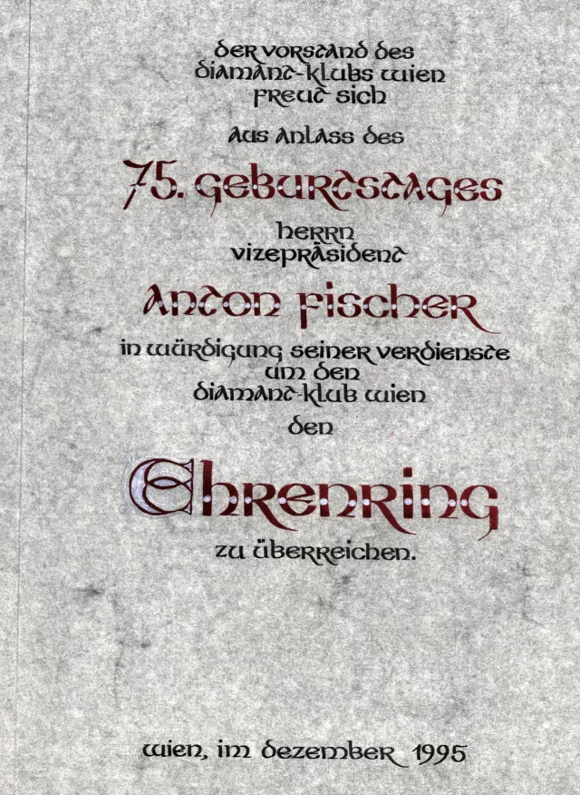 Das ist eine Urkunde anläßlich meines 75. Geburtstages, die mir der Diamantenklub 1995 in Wien überreichte.