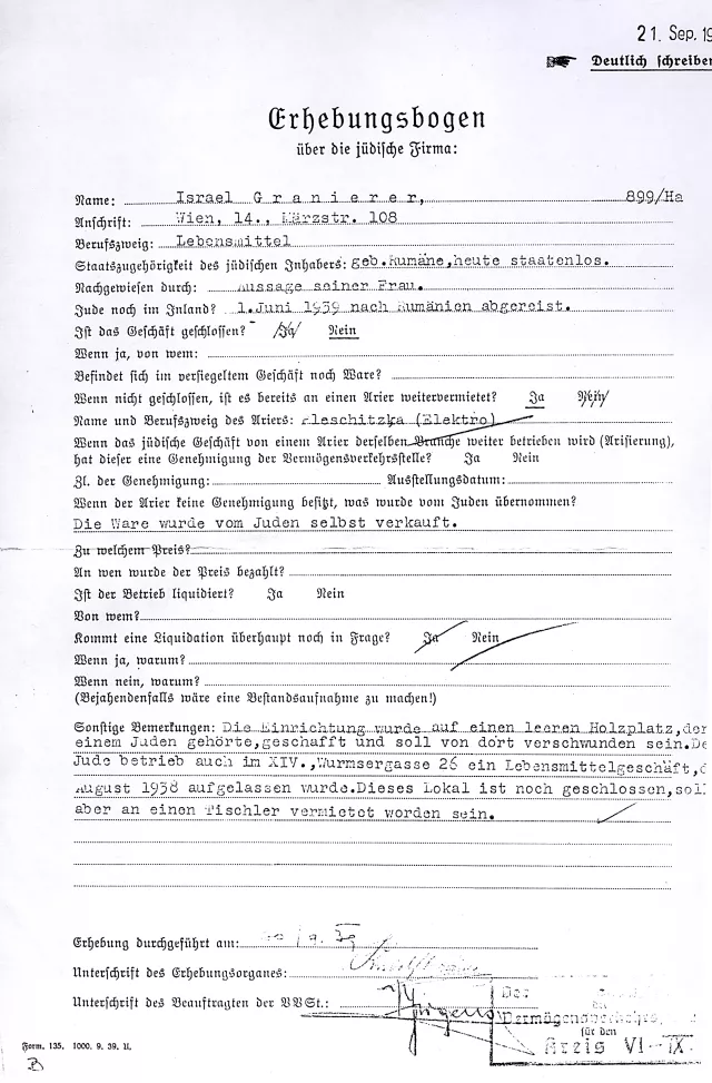 Im Zuge der Arisierung der beiden Lebensmittelgeschäfte meines Vaters ist erst einmal sein Vermögen mit diesem Erhebungsbogen festgestellt worden.