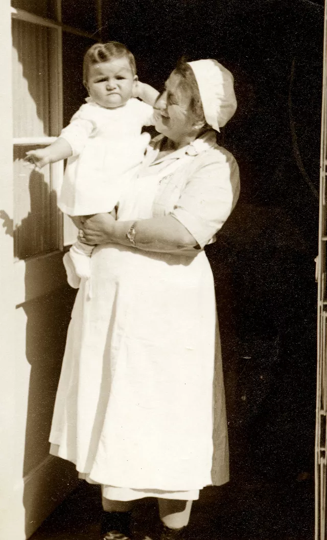 Das Baby auf dem Bild ist vom steinreichen Mann, die graue Eminenz von der CA. Ein ganz großer Mann. Die Frau im Bild ist die Detta, das war das Kindermädchen. Meine Frau hat sie getroffen und ist mit ihr spazierengegangen. Das war 1955.