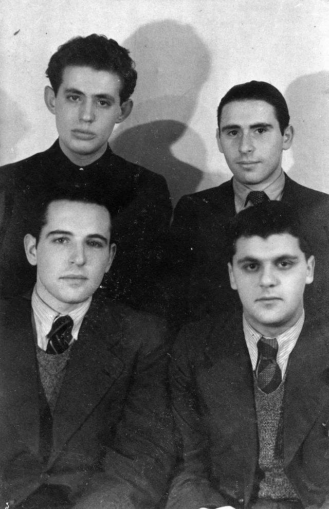 Links neben ihm sitzt der Leo Weichler. Er lebt heute in San Francisco. Der oben links, der lebt nicht mehr, und der neben ihm lebt heute in Montreal, in Kanada.