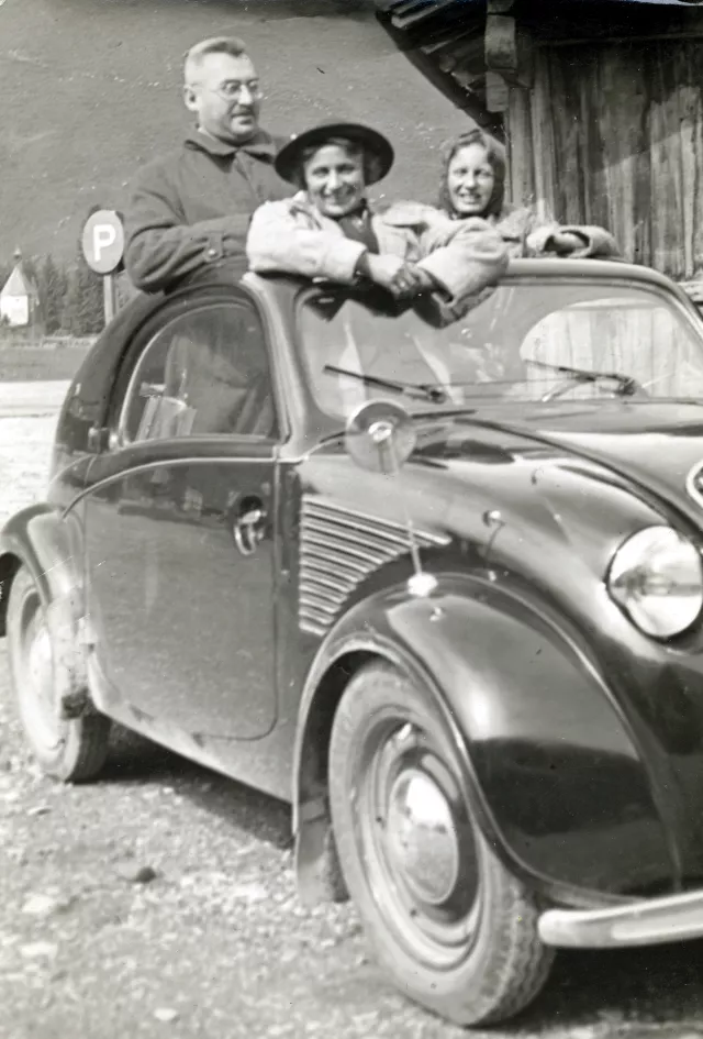 Das sind mein Vater der Rechtsanwalt Dr. Richard Engler, meine Tante Helene Goldberger und meine Mutter Clara, während eines Ausflugs mit dem ‘Steyrer Baby’, das meinem Onkel Ernst Goldberger und meiner Tante Helene gehört hat.