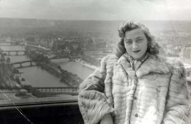 Hier stehe ich auf dem Eifelturm und schaue auf die Seine [Fluss]. Mein Mantel ist vom Liska [Modehaus] in Prag.