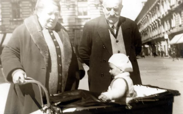 Das bin ich im Kinderwagen mit meinen Großeltern mütterlicherseits.