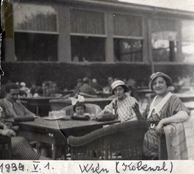 Auf diesem Foto sieht man meinen Onkel Samuel Halpern, der Rechtsanwalt war, meine Mutter Gizela Kocsiss, ihre Schwester Sabina Halpern und mich mit der großen Schleife.