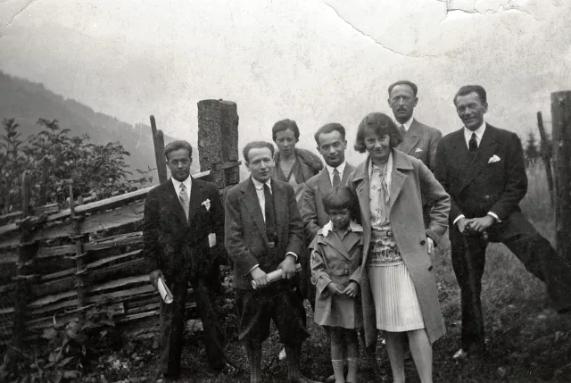 Meine Familie ist auf einem Spaziergang. Von links nach rechts: Den ersten Mann kenne ich nicht. Neben dem fremden Mann steht der Joseph Geduldig, der Cousin meines Vaters.