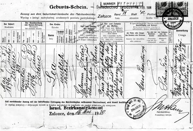 Das ist der Geburtsschein meiner Tante Lea Seliger, geborene Feder.