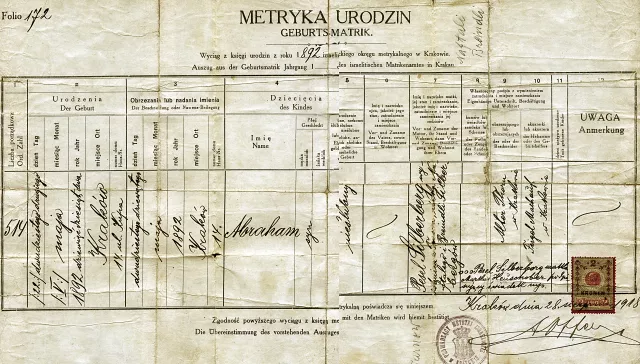 Dies ist die originale Geburtsurkunde meines Vaters Abraham Silberberg vom israelitischen Matrikelamt in Krakau [Polen].