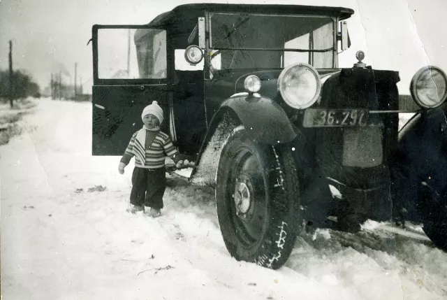 Das ist im Winter 1934. Ich bin zwei Jahre alt und stehe in Ober Waltersdorf neben unserem Auto.
