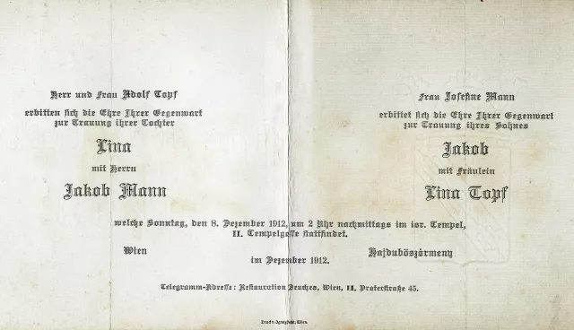 Herr und Frau Adolf Topf erbitten sich die Ehre Ihrer Gegenwart zur Trauung ihrer Tochter Tina mit Herrn Jakob Mann