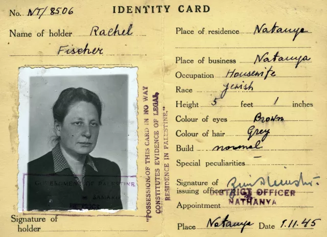 Das ist die Identitätskarte von meiner Mutter, Rene Fischer, geborene Wertheim, in Palästina. Das Foto dafür wurde 1945 in Natanya aufgenommen.