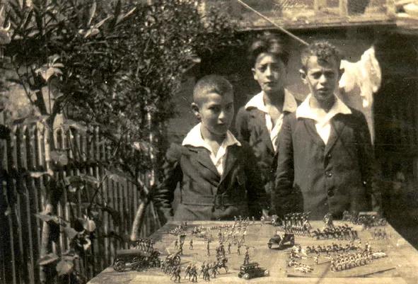 Hier sind wir im Garten hinter dem Haus mit meinen Cousins Hans und Paul und meinen Zinnsoldaten.