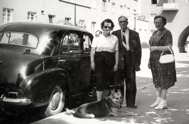 Julius Chaimowiczs Eltern Miriam und Salomon Chaimowicz 1952/53 in Wien mit ihrem zweiten Auto und Hund (rechts daneben eine Nachbarin)