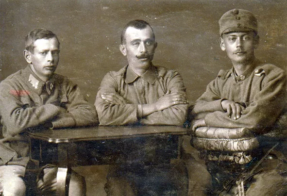 Hier sind mein Bruder Raul, der Offizier war, mein Bruder Julius und der Mann meiner ältesten Schwester Eugenie, Lazar Rosenberg, während des Ersten Weltkriegs in der Uniform der Österreich-Ungarischen Armee zu sehen.