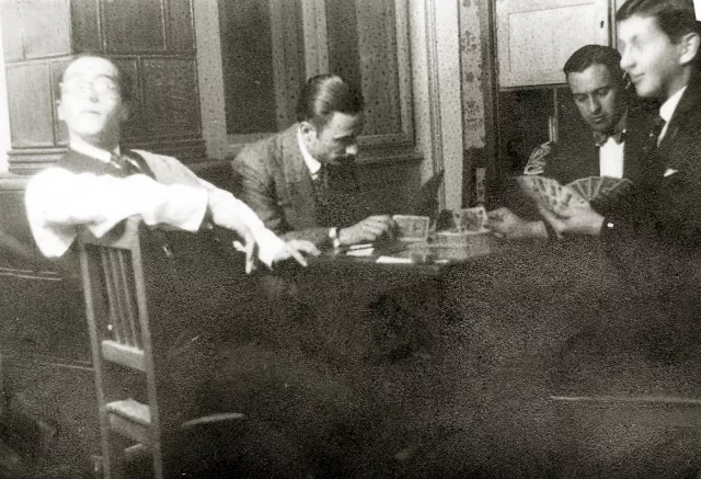 Auf diesem Foto sitzt ganz links mit der Brille mein Cousin Paul im Jahre 1928 mit Freunden im Kaffeehaus in Zemun beim Preferanzen.