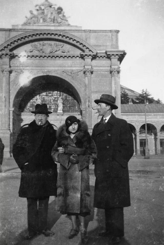 Auf dem Foto, ich weiß leider überhaupt nicht, wo das gemacht wurde, steht der Leo Geduldig, der Bruder meines Vaters, in der Mitte seine Frau Hanni, und rechts steht mein Vater Roman Abraham.
