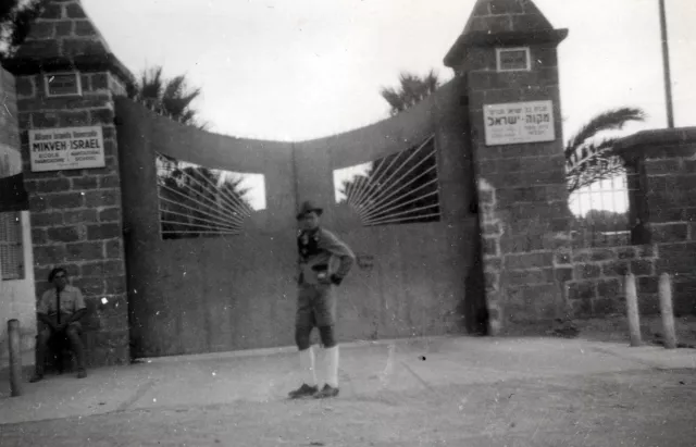 Das bin ich im Jahr 1940 vor dem Haupteingang von Mikve Israel in österreichischer Tracht mit weissen Stutzen und mit der Lederhose.