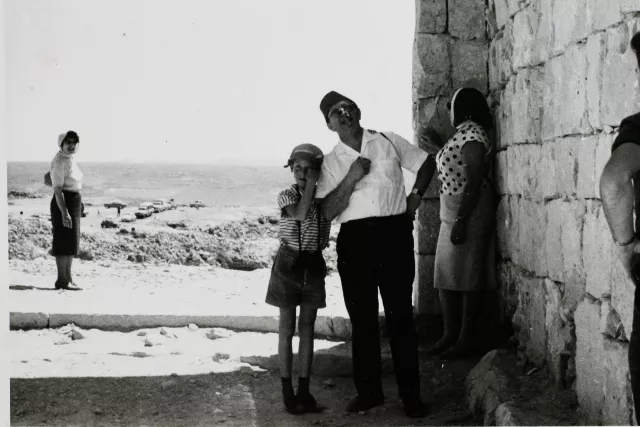 Ich glaube, dieses Foto von meinem Mann Moshe und meinem Sohn Rafi wurde während eines Ausflugs in Caesarea gemacht. Die Frau in der gepunkteten Bluse bin ich.