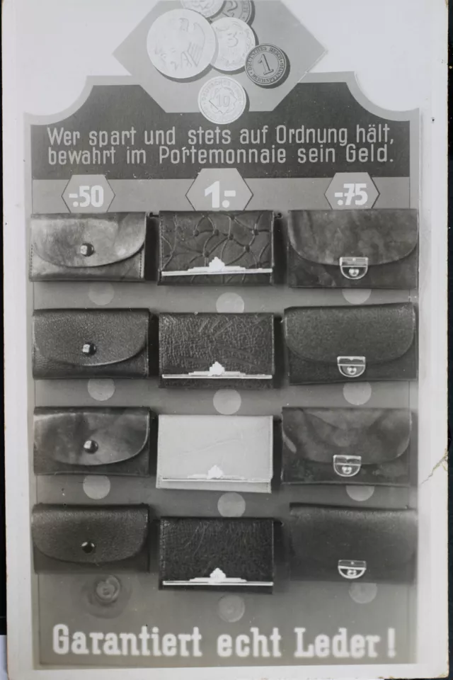 ‚Bist du klug und auf der Höh', trag' dein Geld im Portemonnaie’ oder ‚wer spart und stets auf Ordnung hält, bewahrt im Portemonnaie sein Geld’ warben für seine Portemonnaies.