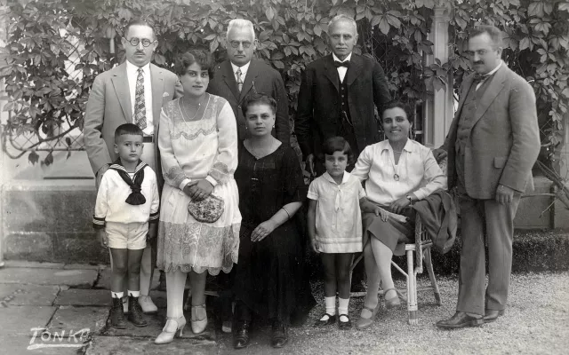 Leopold Ofner, der Ehemann meiner Tante Ella. Vor meinem Vater stehe ich, ungefähr fünfjährig, neben mir ist meine Mutter, daneben sitzt meine Großmutter Risa, neben ihr steht meine Cousine Vlasta und daneben sitzt deren Mutter, die Tante Ella.