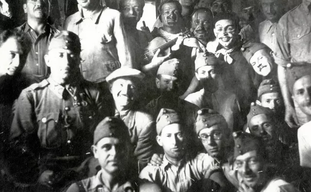 Wachpersonal und Arbeitsdienstler gemeinsam während einer Theatervorstellung