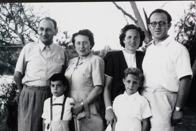 Der Mann meiner Schwägerin und besten Freundin Lotte, der Yehuda Ickelheimer, Ickel haben wir ihn immer genannt, daneben ist die Lotte, neben Lotte stehe ich und neben mir steht mein Mann Moshe.