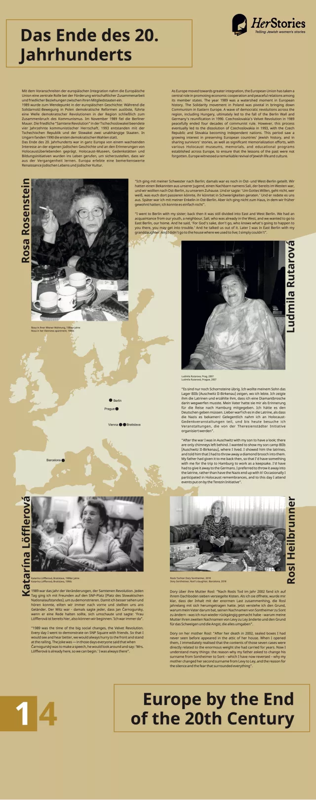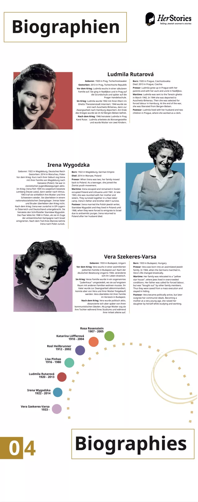 Travelling in the footsteps of seven European Jewish women ‒ through time and space ‒ we can see where they were in particular moments in history, what they experienced and how they felt during the first decades of the 20th century, the interwar period, the dark years of the Second World War and the Holocaust, and postwar Europe. Oral history interviews with Rosa, Katarína, Ludmila, Irena, and Vera, Lisa's memoir and biography, and the account of Rosl's daughter Dory, give us invaluable insight into their lives.