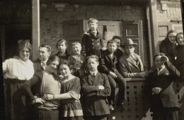 This is our family on the porch of our house in Jonava. From left to right: mother's sisters Masha Granevich wearing a white blouse, in the bottom row to the right are Frida Shlapoberskaya and Bluma Epstein, next to them is their brother David Pagirskiy and my father Abram Yudelevich wearing a hat, then my cousins Aria Shlapoberskiy, Eliahu Shlapoberskiy standing and in the center my youngest brother David Yudelevich, the picture was made in 1927.