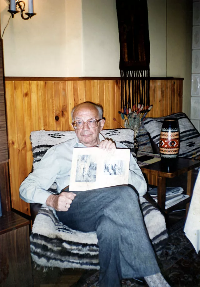 This is my husband's most recent picture, taken two years ago. The photo was taken in our apartment in Cracow. He holds a book written by my friend Lea Shinar. She wrote six of them and I don't recognize which one it is.