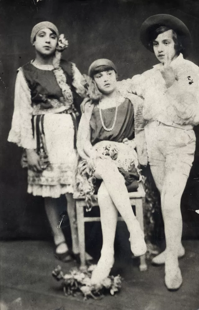 Here I'm a high school student. The photo was taken in the 1930s in Vidin. My classmates and good friends Sarika and Mati - first and second from left to right - are wearing Bulgarian folk costumes, and I, first from right to left, am in my ballet costume. I guess the photo was taken during a school holiday, for which we had prepared a performance.