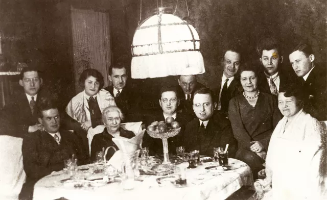 This is a party at the Inlenders’, in Aunt Rywka’s apartment. You can see my mother, Ajdla Goldwag, nee Meisels, sitting on the right side. My older brother Bernard is standing behind her. The woman sitting on the left side is Mrs. Goldsztajn. I don’t know who took this photo.