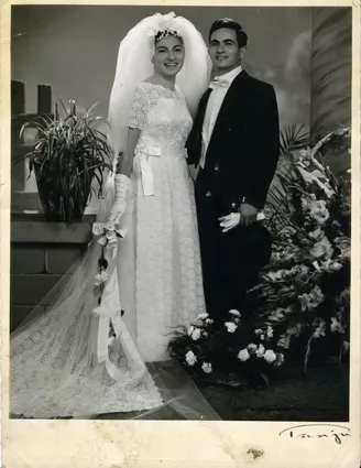 This photograph was taken in 1965 at Tanju. After my wedding, we went to Tanju again and pictures were taken. Afterwards because we are from Edirne, we went to my father-in-law’s house, we had an afternoon meal called desayuno. Afterwards our reception was going to be at Ortaköy Lido. Because it was September 12th, our wedding was going to be in a closed space. But because they reserved the inside for other people, there was an Armenian engagement party, they seated us outside in the open. We objected but could not convince them. But thank G-d, it was outside, the weather was so nice, we had a much better time, the other wedding party sweated in the enclosed space.