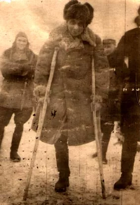 This is me in late 1944 being wounded on my way to the hospital in Moscow. These are the crutches, which helped me to get better. Now they are in the Museum of the Partisan Movement in Saint Petersburg.