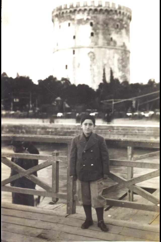 Here I am in front of the White Tower of Thessaloniki, which was painted white for camouflage purposes, so it wouldn't be seen or stand out during the wars. I am wearing my school trousers. The photo was probably taken before the war, in the 1930s.