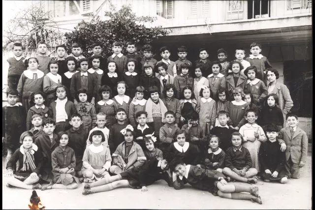 This is a class portrait of the elementary school of Mrs. Schina in Thessaloniki. It was taken in 1934. You can see our teacher Maria Koniordou, and I am there at the back, third from the left.