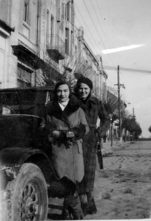 My mother Suzana Hacker and a friend from school Ela Fein in front of the Hacker family Ford in Senta 1931. They are standing in front of the Hotel Bela Ladja, close to the center of Senta. My grandmother traveled a great deal and that is probably how they came to have a car at that time.